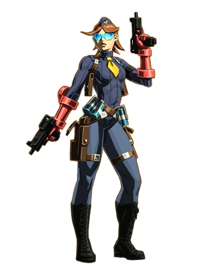 - Na história de Street Fighter V, A Shadow Falls, ela é vista empunhando duas pistolas automáticas que se parecem com duas Ingram MAC-10, a julgar pela coronha retraída, design geral e modo de disparo.