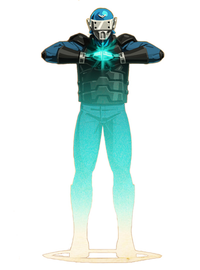 Arkane is equipped with an ultrasonic vibration device that allows him to teleport and generate electricity for use in his attacks. Being a cyborg, he's also able to stretch his arms and legs.