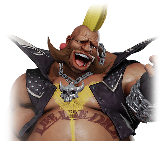 In Street Fighter V, Birdie is presented as more of a comical glutton who enjoys eating, even during fights. Although still just as rude and brash, Birdie seems to be markedly less aggressive towards others, likely due to the fact that he is no longer a part of Shadaloo. He is also very conscious of his Mohawk and hates wearing any hats, as he believes it would mess up his hairdo.