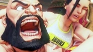 Zangief delivering the Bolshoi Russian Suplex to Cammy.