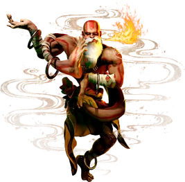 According to his official profile in the Japanese Street Fighter V site, Dhalsim's fire is actually an illusion that he manipulates with the help of the god Agni.[5] In the UDON comics, the flames won't hurt a person if they believe that they won't be burned; he proves it via engulfing Adon in flames, and as he recoils and notices he's not getting burned, taking advantage of Adon's confusion to knock him out. Also, in Super Street Fighter IV, he calms Hakan after defeating him by mentioning that his fire is only an illusion that won't burn his oil. Furthermore, when defeating Dhalsim, Zangief boasts that Dhalsim's imaginary flames have no chance against his own real muscles. In the original Street Fighter IV, Seth also made a similar boast.