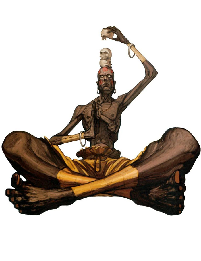 Dhalsim's minimal clothing and necklace of skulls are reminiscent of the Hindu ascetics known as Kapalikas ("skull-bearers"). Like Blanka and Urien, Dhalsim's alternate costumes change his skin color, usually to a shade of grey or yellow reminiscent of the ash that Hindu holymen cover their bodies in.