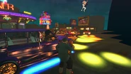 A drive-in diner in North America. Lowrider vehicles are lighting the fight area with their headlights, with some of them bouncing on their hydraulics. Spectators can be seen both on top of the vehicles and also surrounding them. When one of the fighters is knocked out, the crowd will cheering for the last person standing.
