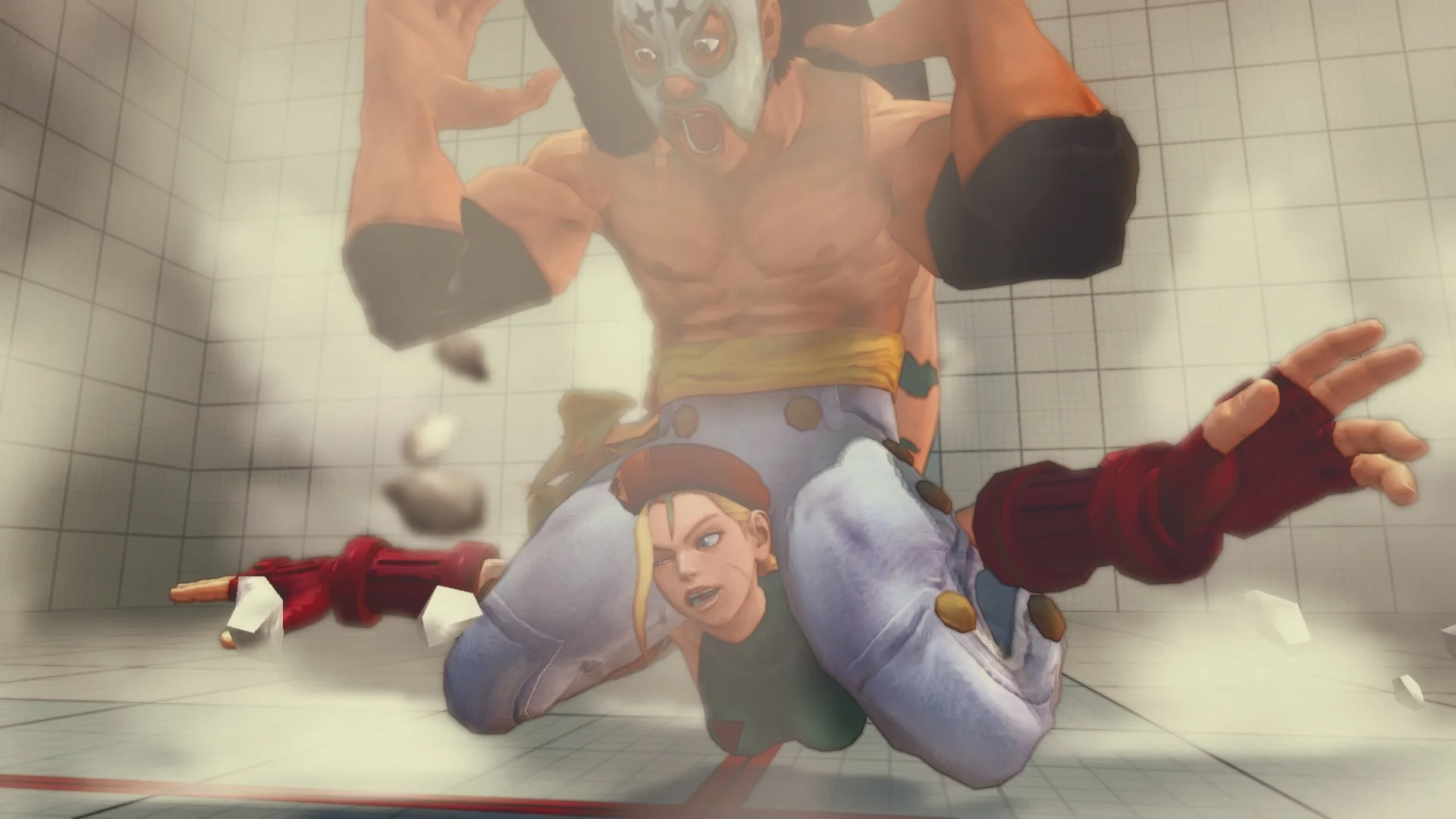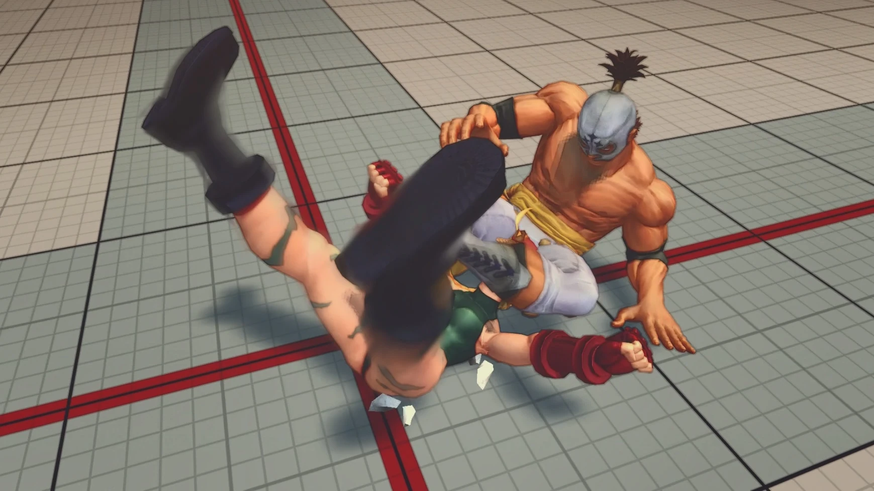 El Fuerte slamming Cammy into the ground using El Fuerte Flying Giga Buster.