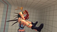 If the Cannon Spike does not connect correctly, then the combo will end there; however, if it DOES connect correctly, Cammy will then leap into the air, grabbing her opponent by the collar or shoulders; as she reaches the peak of her jump upside-down, she will spin around, then fall, driving her foe into the ground while straddling them, performing a neckbreaker. In total, the attack is an 8-hit combo if it connects perfectly.