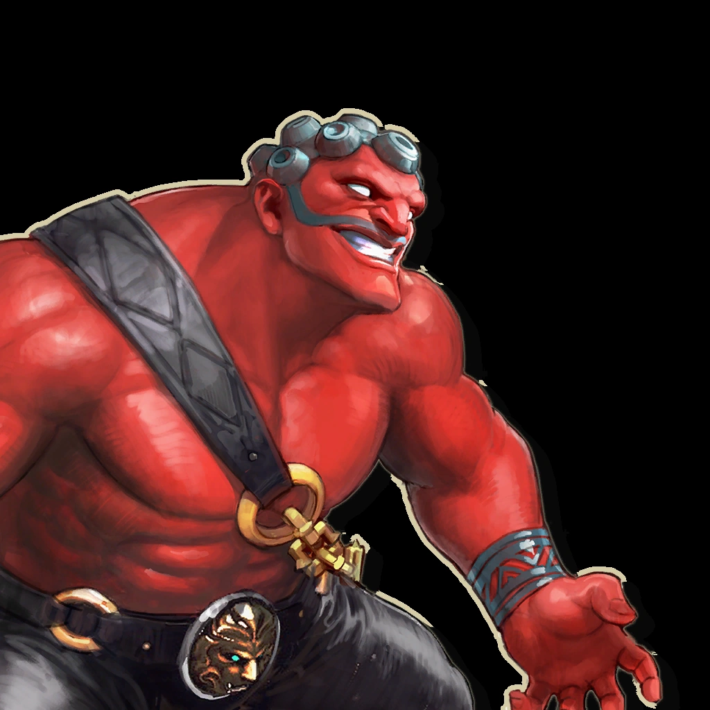 Hakan is a huge Turkish oil wrestler with deep red skin and a strong Turkish accent. He has strange turquoise hair worn in circular curls aligned rather symmetrically on his head and a large mustache. He wears a large belt that not only bears a golden lion's head as its buckle, but also cradles an enormous golden chain that links from belt to shoulderpad like a bandolier. He wears tight blue pants moderately similar to traditional Yağlı güreş garb, but they are adorned with golden ringlets and leather bands. He also wears wristbands and anklebands.