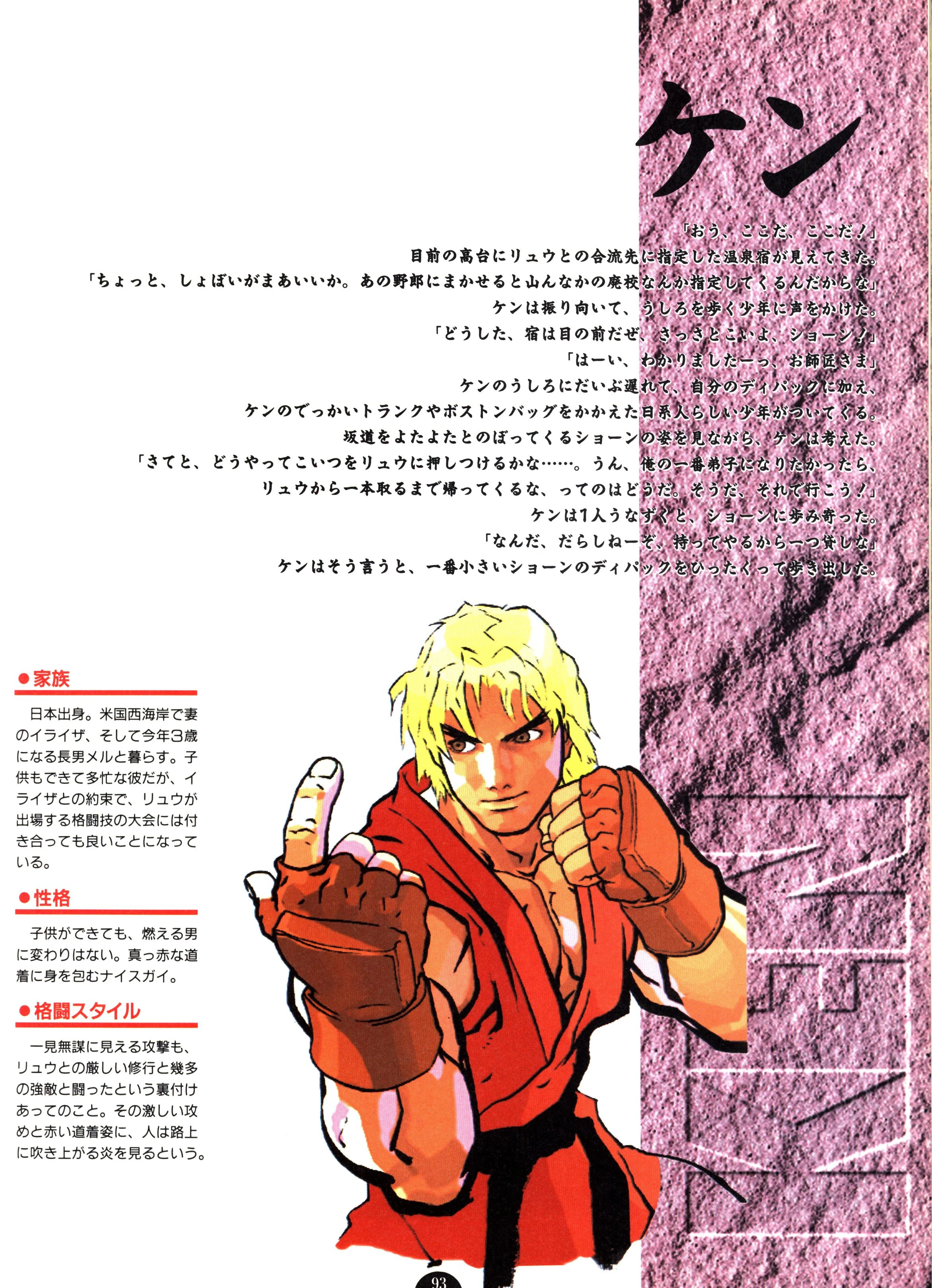 建物一つ離れた路地でそうつぶやく男がいた。ホットドッグを片手に、こっそりと様子をうかがうケンだった。) from Sean's backstory in All About Street Fighter III: The Fighting Bible, page 246 - ↑ "However, there was only the appearance of Ken Masters (National Fighting Champion), who was completely reluctant to speak to the woman next door."(しかしもつて全くきをよそに隣の女性を口足いているケン・マスターズ (全米マーシヤル ・マーシ・チ ャ ン ピ オ ン) の姿があるだけであった。)