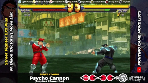 Psycho Cannon (サイコキャノン Saiko Kyanon?) is one of M. Bison's Super Combos in the Street Fighter EX series. It also appears as Ed's first V-Trigger in Street Fighter V, and his Level 2 Super Art in Street Fighter 6.
