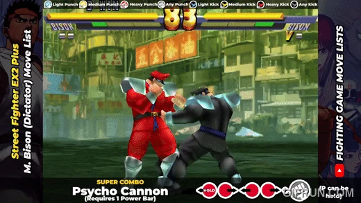 Bison holds a ball of Psycho Power energy (similar to the Psycho Shot) in one palm in front of him like he is blocking, then tosses it forward with the other free hand. It can also be charged up to increase its size, and thus inflict more damage through added hits on the opponent. This version also tends to rapidly change colors as well. The attack can also damage opponents and launch them into the air slightly per hit while they are caught in its range while charging it.