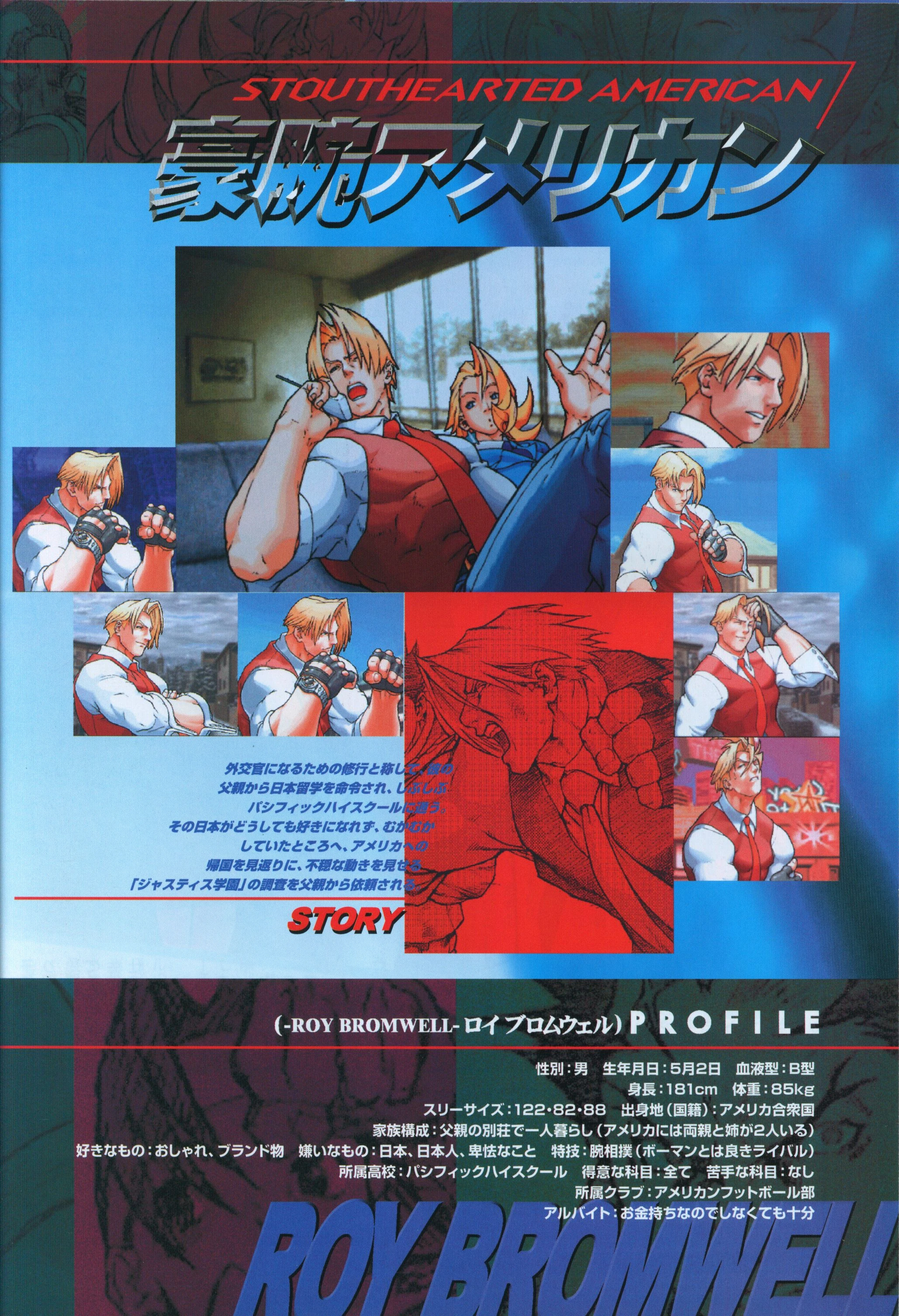 A rich foreign exchange student from the United States, he is often portrayed in the games as the rival to Batsu. Roy is the star quarterback of an unbeatable American football team and is seen as an idol by fellow male students in his home country. His fear and hatred for Japan and its people in United by Fate stems from the fact that his grandfather would constantly tell him of how he lost his left leg during the Second World War.