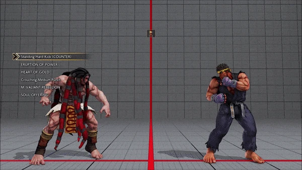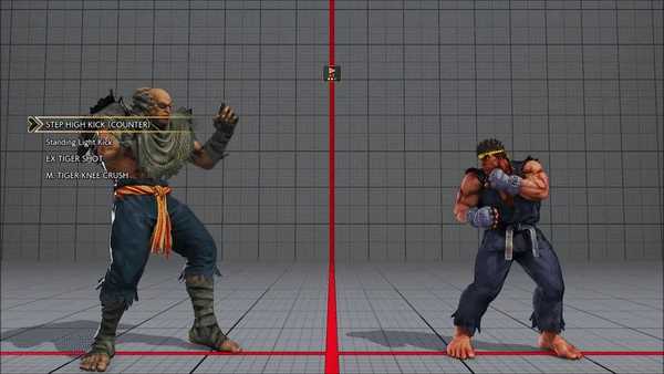 - Standing (Counter) - Heat Rush - Crouching - Chin Buster 2nd - Hadoken - Tatsumaki Senpukyaku