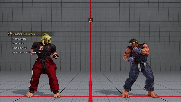 - Crouching - Hadoken - Heat Rush - Lion Breaker - Tatsumaki Senpukyaku