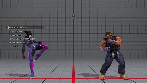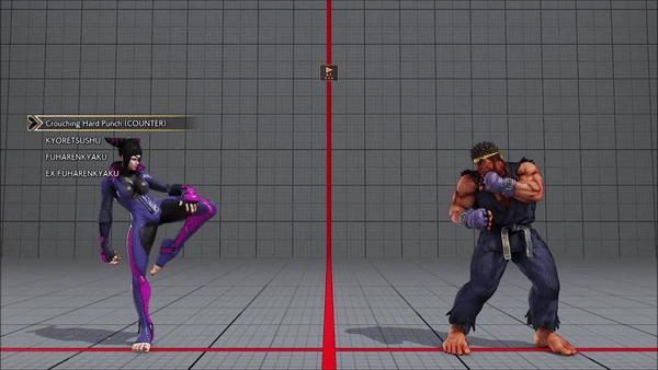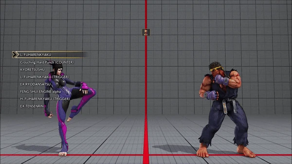 - Standing (Counter) - Quick Step - Chin Buster 2nd - Hadoken - Heat Rush - Hadoken - Guren Enjinkyaku